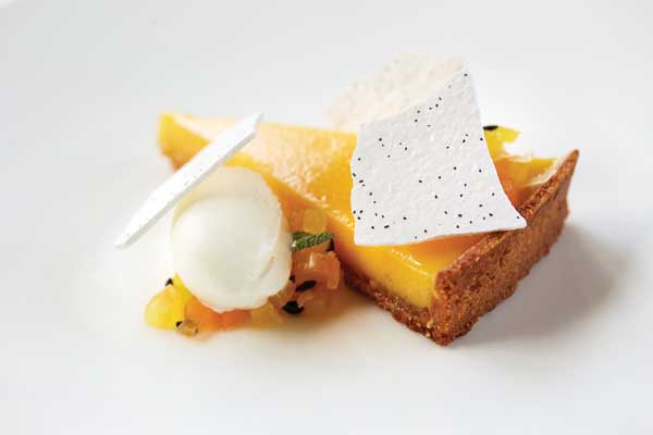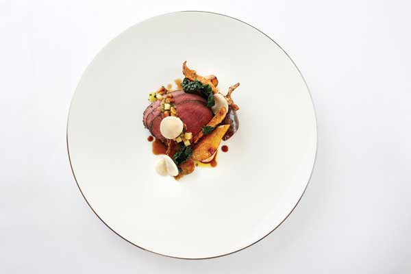 Второй шедевр нашего ужина – омлет из омара с приложением картофельных чипсов, приготовленных в гусином жиру и салата «Цезарь» (Glazed lobster omelette, duck fat chips, lobster Caesar salad). Ах, как описать этого чемпиона, нет, короля омлетов?! Кто устоит перед этим сладостным искушением сливок, сыра, яиц и морских деликатесов? И только появление главного блюда – «седла барашка», с детства знакомого по многотомнику «Саги о Форсайтах», остановило мои наскоки на тарелку соседа (Saddle of venison, salsify, French toast, pickled red cabbage, toasted hazelnut crust). Оба десерта – и шелковисто-бархатный шоколадный мусс в компании молочного мороженого с экзотическими нотками гибискуса и освежающей кислинкой листочков красного щавеля (Dark chocolate mousse, raspberry, milk hibiscus ice cream, red sorrel); и яблочный пудинг с аккомпанементом кастард и яблочного сорбета (Marigold apple, sweet woodruff, buttermilk custard, green apple sorbet) напомнили нам добрых старых друзей в новых нарядах. Коронные блюда британской кухни лидируют в меню, и шеф Шей Купер, завоевавший ресторану в 2016 году мишленовскую звезду, творит их на основе местных сезонных ингредиентов самого высокого качества. Обращаясь к классическим английским блюдам, Купер тактично привносит в них элементы современной гастрономии и утончённость высокой кухни. Его кулинарная этика и изысканный стиль презентации органично дополняют друг друга, при этом как-то очень естественно вписываясь в общую атмосферу и дух отеля.