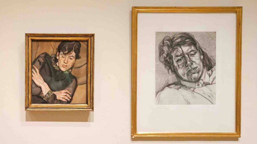 Выставка аккуратно выстраивает диалог между листом бумаги и холстом. В одном зале — серия рисунков, где художник изучает лицо модели снова и снова. В следующем — крупная живописная работа, где то же лицо превращается в сложную топографию. И тут возникает почти физическое ощущение, что живопись для Фрейда — не украшение рисунка, а его продолжение другим языком.